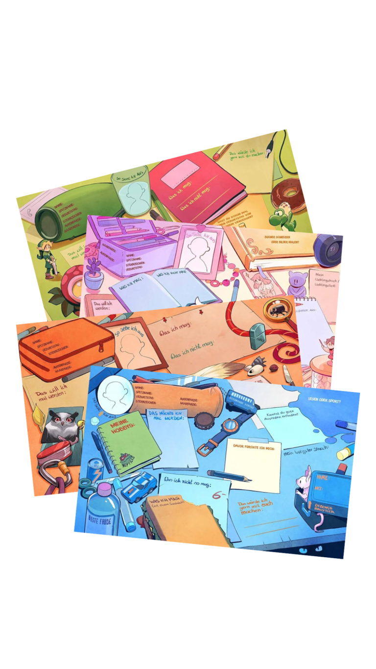 - grüne Doppelseiten sind für Kinder gedacht, die gerne spielen und lieber Ankreuzen als lange Auszufüllen